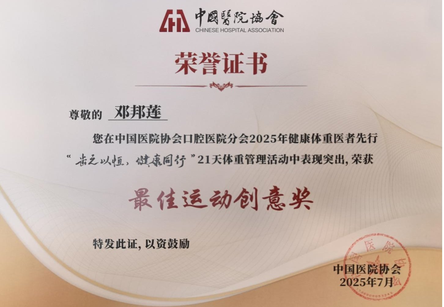 在同期舉辦的2025 年健康體重醫(yī)者先行“齒之以恒,健康同行”21 天體重管理活動(dòng)中,西安聯(lián)邦口腔醫(yī)院同樣表現(xiàn)突出。醫(yī)院榮獲單位組織獎(jiǎng),這不僅是對(duì)醫(yī)院在活動(dòng)組織和動(dòng)員能力上的肯定,更是對(duì)醫(yī)院在健康理念傳播和患者健康管理方面所做努力的認(rèn)可。同時(shí),鄧邦蓮院長(zhǎng)憑借其在活動(dòng)中展現(xiàn)的卓越創(chuàng)意和專業(yè)素養(yǎng),榮獲最佳運(yùn)動(dòng)創(chuàng)意獎(jiǎng)。鄧院長(zhǎng)的創(chuàng)意不僅為活動(dòng)增添了趣味性和吸引力,也為口腔醫(yī)療機(jī)構(gòu)在健康體重管理領(lǐng)域的實(shí)踐探索提供了寶貴的經(jīng)驗(yàn)。