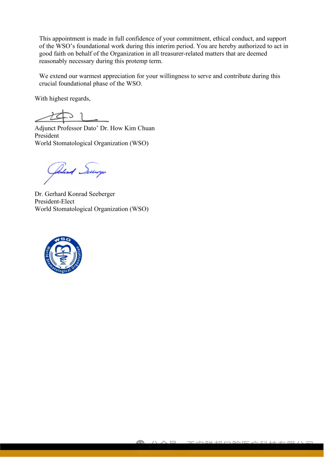 世界口腔醫(yī)學(xué)組織(WSO)財(cái)務(wù)主管臨時委任函