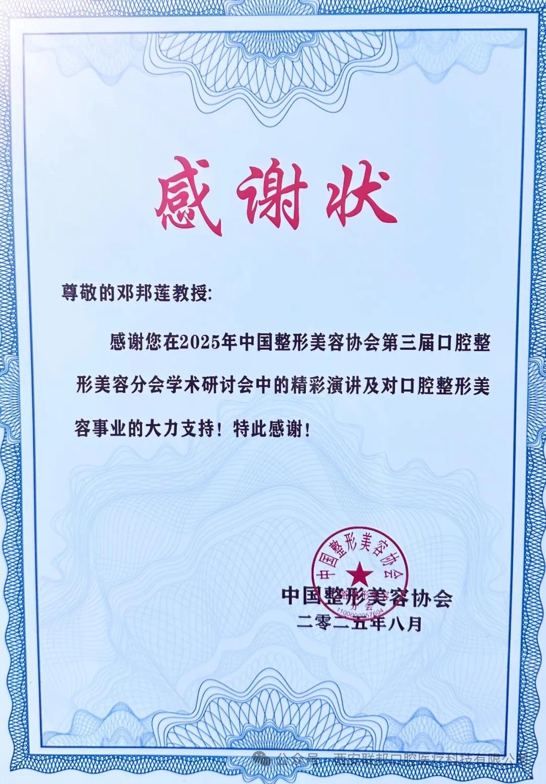 2025年8月7日至8日,中國整形美容協(xié)會第三屆口腔整形美容分會第二次常務(wù)理事會暨學(xué)術(shù)研討會在烏魯木齊盛大召開,西安聯(lián)邦口腔醫(yī)院院長鄧邦蓮博士受邀出席,并在學(xué)術(shù)研討環(huán)節(jié)以《垂直向隱形矯正對微笑美學(xué)的影響:臨床案例分析》為題,發(fā)表了精彩演講。