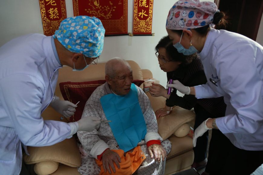 (欄目訊)4月17日西安聯(lián)邦口腔醫(yī)院院長鄧邦蓮帶領(lǐng)楊富生教授、醫(yī)生巨妍靜、護士尚瓊杰、辦公室主任楊超,來到未央?yún)^(qū)泰和居小區(qū),給102歲老人沈福根進行了口腔免費治療,家屬和老人非常開心。